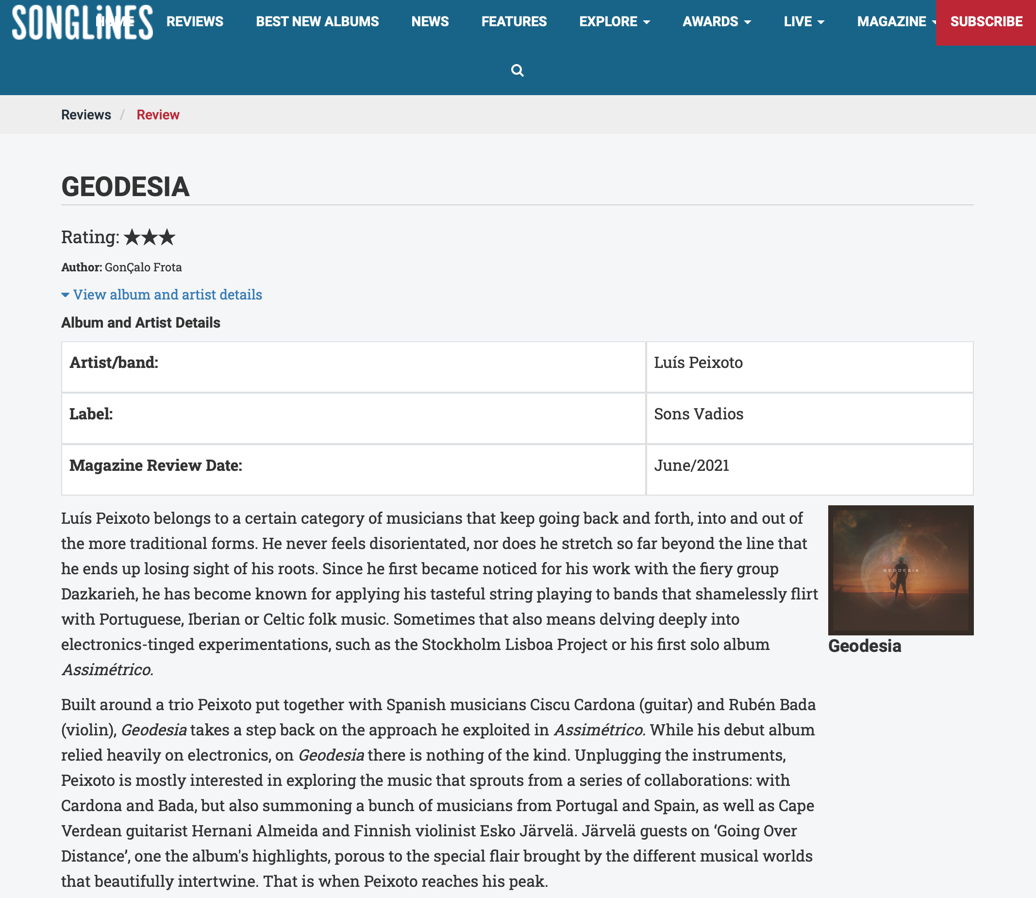 Review – Songlines Review – Time Out Portugal Review – World Music Central Top 10 – April 2021 – World Music Charts Europe Press article – Público, Ípsilon